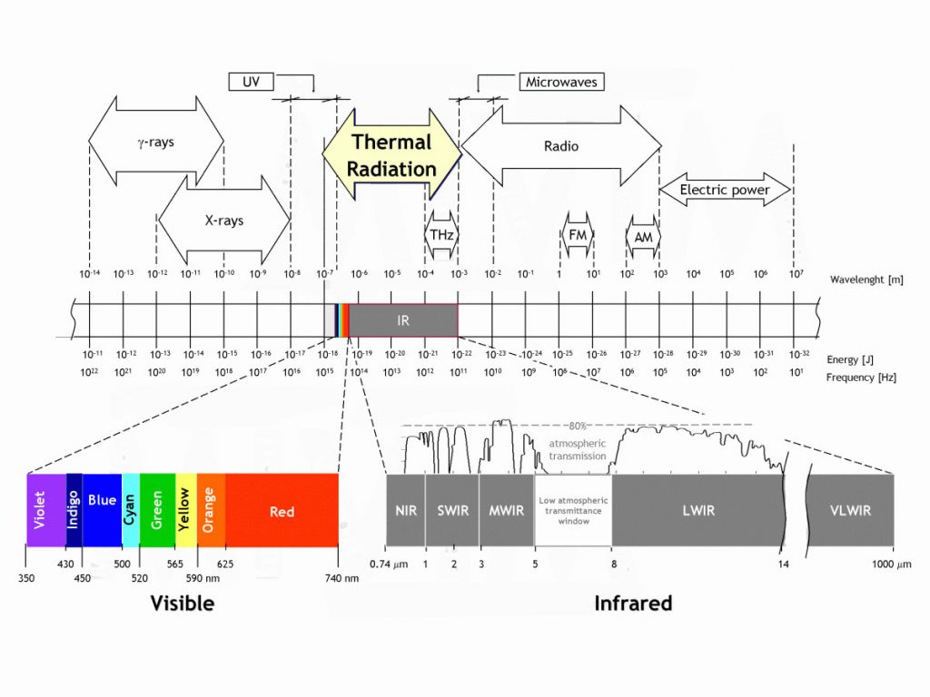 La radiación infrarroja, o radiación IR es un tipo de radiación electromagnética, de mayor longitud de onda que la luz visible, pero menor que la de las microondas. Consecuentemente, tiene menor frecuencia que la luz visible y mayor que las microondas. Su rango de longitudes de onda va desde unos 0,7 hasta los 1000 micrómetros. A efecto prácticos, en esta publicación, nos quedaremos que las cámara térmicas son de Onda Larga (LWIR – Long Wave Infrared Radiation) que van desde los 8 a los 14 µm