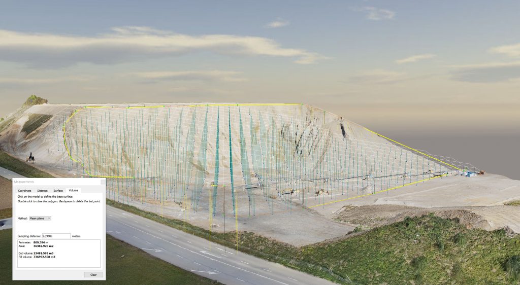 Con el software de mapeo 3D, también es posible obtener medidas volumétricas a partir de las mismas imágenes. Este método rápido y económico de medición de volumen es particularmente útil para calcular las existencias en minas y canteras con fines de inventario o seguimiento.